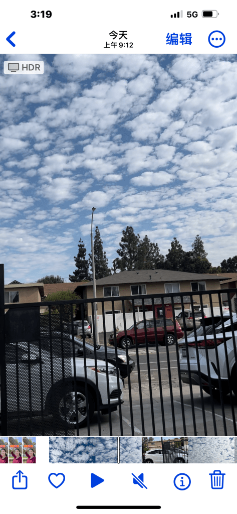 早上9点多出门,正在目光平视地朝大门外的汽车走去,突然被一股无形的力量牵引,猛然抬头看向天空,瞬间为之惊叹不已!多么美丽的云朵,多么奇妙的天空啊!只见深蓝的天幕中,被一团团、一簇簇、一片片的白云覆盖着,铺满了整个天空,井然有序地排列开去,仿佛是被人特意放置好的,又好像是有生命和意识的,如此栩栩如生、整齐规则地铺满了天空。