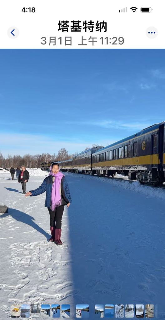 极光列车是阿拉斯加铁路公司运营的一条风景优美的铁路线路,连接安克雷奇和费尔班克斯,距离约470英里,单程约12小时。中途会在几个景点停车15分钟,让旅客下车活动和拍照。车上开着暖气,有洗手间、餐厅和酒吧,Jean和碧婉坐在靠窗的桌旁边喝酒边欣赏窗外的风景,诗曼还喝了鸡尾酒,很有轻奢气质。列车在风景如画的阿拉斯加腹地穿行,穿越楚加奇国家森林(Chugach National Forest),这里有茂密的森林、冰川和雪山,景色非常壮观。经过斯宾塞冰川(Spencer Glacier),这是一个非常受欢迎的徒步和皮划艇目的地,德纳里国家公园和保护区(Denali National Park and Preserve),还有阿拉斯加内陆冰雪覆盖的森林、山脉与河流,景色如画,沿途有机会看到麋鹿、驼鹿、狼、鹰等野生动物。列车行驶速度不快,让人在悠闲放松中,欣赏窗外大自然的梦幻奇景。更令人惊喜的是,有机会在旅途中欣赏到壮丽的北极光,因为列车经过的偏远地区光污染少,容易看到极光。