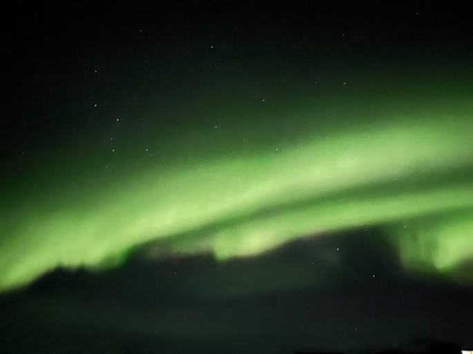 每个人都仰望夜空,举着手机或相机对着极光拍照,顾不上戴手套保暖,不理会路上偶尔呼啸而过的汽车带来的强光和惊扰,此刻只有满天的星辰和满眼的极光,以及迸发喜悦激情的胸膛。通过镜头,绿色的极光出现在我的眼前,与我是如此地接近,它色彩艳丽,移动变幻,神秘莫测。我贪婪地看着,仿佛要把它装入眼中、放进心里。在众人的目光追逐和声声赞叹中,那道白光越发地明亮和扩大,仿佛是在回应我们爱的呼唤。这是我生命中第一次看到极光,虽然与想象中能够肉眼看到颜色的情形不一样,有点失落,但这并不影响我观赏极光的兴致和热情,因为我知道它就在那里,它的美丽和璀璨就在那里,它的辉煌和神奇就在那里。事实上,内在的感受比肉眼所见更真实,因为那是一种内在的深刻连接。
