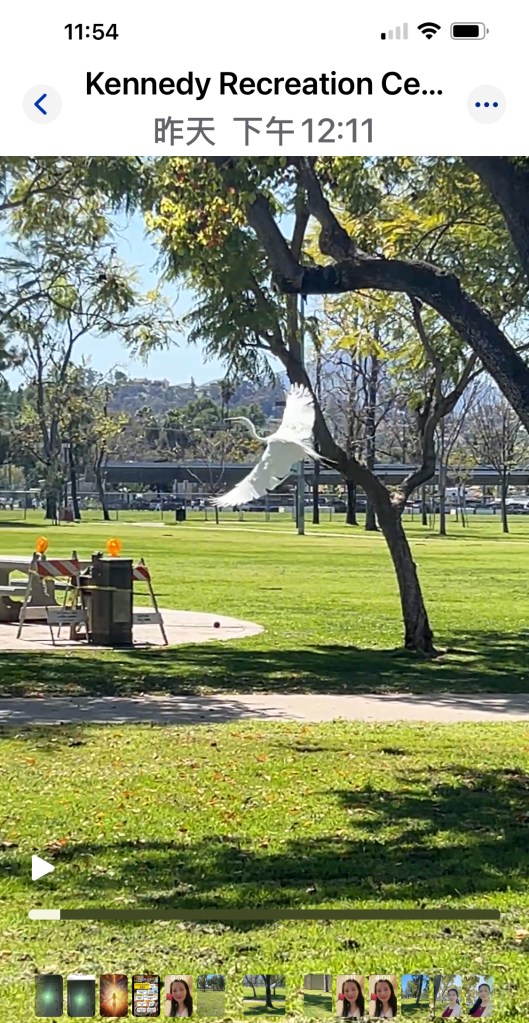 正当我沉醉其中时,突然受到一种力量的牵引,不由自主地猛然转头,看向游乐区的方向,正奇怪为何会这样做时,目光就落在了不远处草地上的一个白色物体上,眼前顿时一亮!只见一只白色大鸟模样的东西立在草地上,尾巴朝向我这边,扭头看向我的方向,仿佛在和我对视。两根又细又高的脚定在那里,一动不动,浑身雪白的羽毛,可以看见尾巴上的长羽毛呈丝缕状,非常丝滑柔软的感觉。这是真鸟还是假鸟?我无法确定,因为它静止不动。再仔细看,它仍是岿然不动,我想,那一定是被公园管理者插在泥地里作为某种标记,或对人们的一种警示的标志牌吧,羽毛制作得如此精细,应该是一个高级标本吧!虽然头脑这么认为,但内心却有一种想要一探究竟的冲动,于是慢慢向它走去,此时内在的声音响起:“拍下来”!不由分说,我快速打开手机的相机,对着它拍照,边拍边挪动脚步向它靠拢,想看看是否是一只真鸟。这时令我惊讶的一幕出现了!它动了!它迈开细长的双脚,步态优雅地向左边走去!它是一只真鸟!这个事实让我意外又惊喜!我从未见过如此美丽的鸟,洁白如雪,颈项颀长,高贵典雅,不染纤尘。更没想到的是,在这个公园,在这样的地方,竟然会出现这种神鸟般的存在。我想把它的美更清楚地拍下来,便加快脚步向它靠近,不料惊吓到了它,刹那间,噗嗤一声,它腾空而起,一道白光划过眼前,它飞起来了!它飞走了!是我吓着了它!是我驱赶了它!看着它翩然离去的身影,心中充满歉意和不舍。这时内在传来一个声音:“仙鹤!”。哦,仙鹤,是的,对我而言,它就是仙鹤,它就是我心中的神鸟,然而它正在离我而去!Oh,No! 你快回来!我在心里呼唤着。然而它在低空中煽动着翅膀,快速地飞向左边的树梢,转眼消逝在我的视线中。