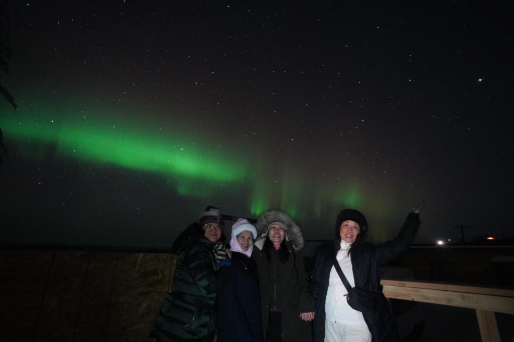 今天是我们在费尔班克斯第三次观赏极光,还是导游小邵在晚上10点开车带我们来到这栋木屋,因为昨晚我们在这里度过了一个美好的夜晚,不仅邂逅了壮美极光,领略了浩渺星空,感受了静美新月,见到了可爱狗狗,还在等光的间隙玩了两场扑克牌,气氛融洽,能量流动,振动提升,开心快乐。因此再次到来,便对这间木屋有一种熟悉和舒适感。今晚的极光之旅,又将带给我们什么样的惊喜呢?