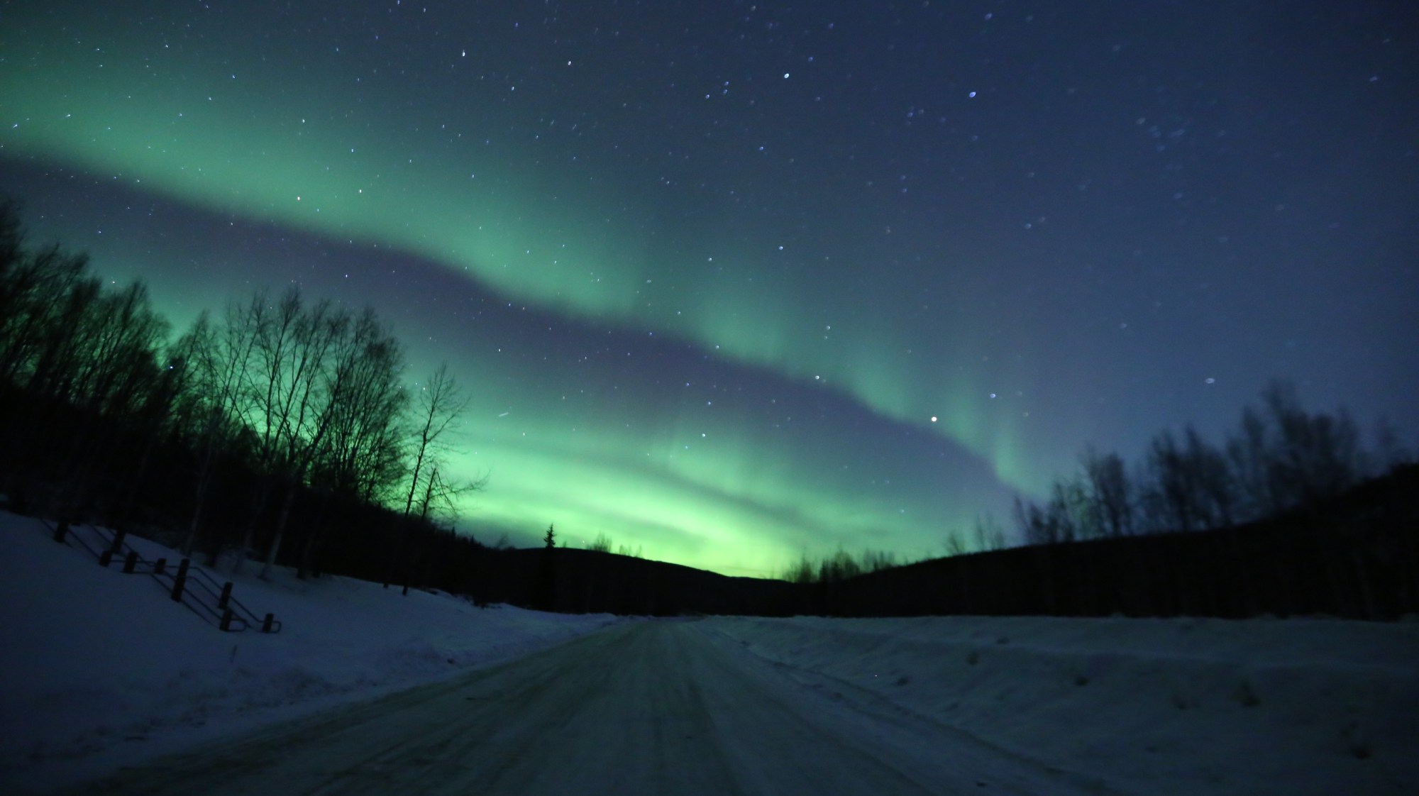 凌晨一点左右,导游观测到今晚可能不会有极光出现了,便宣布返回费尔班克斯的酒店休息。来到户外,导游突然惊喜地叫道:“看,那月亮是黄色的,刚才还是白色的,现在是黄色的,很黄!”,我一惊,“新月是黄色的”?他说:“是啊,黄色的,很亮!”。他边说边走到车子后侧的空地上,我也跟过去看,他边指给我看边说:“你看,是黄色的,非常亮!”。眼前空地没有遮挡物,视野开阔,抬眼看去,新月一览无遗,让我触目惊心,因为,它果然是金黄色的!而且又大又亮,闪着金光,耀眼明亮,像一把金光闪闪的镰刀,又像一根熟透灿烂的香蕉,悬挂在低矮的天边,仿佛就在眼前,伸手就可摘下!太神奇了!这是我从未见过的奇异现象!而这样的细节只有他注意到了,并且很关注和由衷欣喜,可见他内在的灵性意识在苏醒,与自然宇宙有着连接和共鸣。而这让我深感欣慰,因为灵性觉醒是一个人生命中最珍贵的礼物,值得庆贺与珍惜。