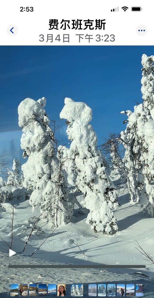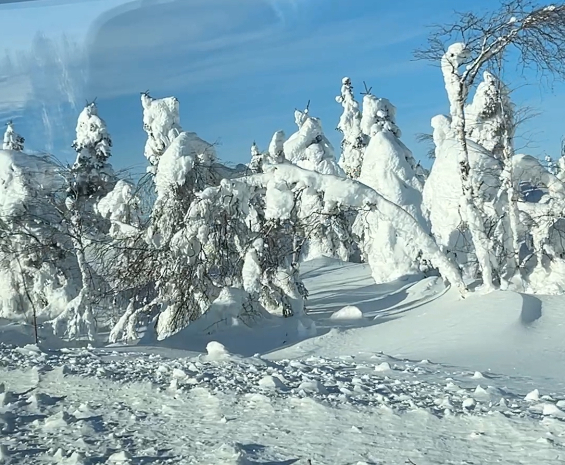 然而就是这片“魔鬼森林”,在我的眼中却是一幅美丽画卷,从眼前疾速地略过,留下一片光和影交织的梦幻。窗外,阳光的温暖与冰雪的严寒,诉说着古老而神奇的故事。目光所及,白雪茫茫中有着绿意盎然,这让我心中充满快乐,这是一种治愈能量带来的喜悦。而那些被积雪覆盖而下垂弯曲的树木,让我心生敬意并充满感激,是它们的强大生命力让这片土地如此神奇。它们在雪地上深深扎根,肆意生长,傲然挺立,坚强不屈。我被它们千姿百态的雕琢深深吸引,全神贯注地欣赏着那稍纵即逝的美丽,为它们的强大生命深感赞叹,为它们的弯曲不折深感震惊。在积雪的覆盖中,那些树木即使不堪重负,也只是弯曲下垂,而不折断,直到冰雪融化,才如释重负,轻盈伸展。就这样日复一日,年复一年, 四季轮回,循环往复。这需要多大的韧性和顽强的毅力,才能抵挡这严寒、战胜这摧残。在这荒芜的极地,它们的存在,就像大自然奏响的一首宏伟生命之歌,无声却有力地回荡在辽阔的雪原,回旋在浩瀚的星空,激荡在我的旅途,萦绕在我的心中。