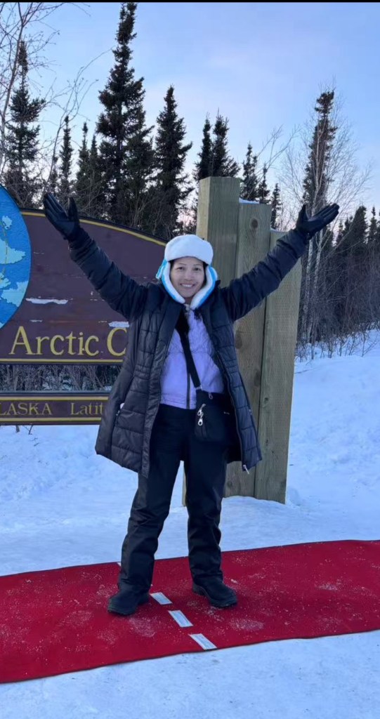 北极圈是北纬66⁰33′的虚拟线,是与道顿公路的交汇点。北极圈地标是为了纪念这条具有神秘色彩的纬线而设立的指示牌,它是进入北极圈的象征。这里就像人迹罕至的世外桃源,终年不化的积雪孕育出最原始的自然美景,激励着无数人探寻它的奥秘。到了北极圈的标志,就正式进入了极地。感受最深的是,北极圈并没有想象中的寒冷和恐怖。上午出发前,Jean曾在酒店大堂问那位木屋看极光时拼车同行的年轻大学生:“北极圈冷不冷”?他毫不犹豫回答:“有风就冷,没有风就不冷”,因为他刚刚到过北极圈,所以很清楚。如今事实证明,果然如此,不觉寒冷。神秘的北极圈,横穿阿拉斯加的内陆地区,是地球的最北端,是世界的尽头,是脚步的终点,再往前就是油田,油田之外就是北冰洋,那是地球的边缘,无法进入,一旦进入,有去无回。