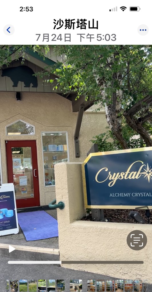 水晶钵店与我入住的民宿同在雪士达大道上,出门右转,沿着街道往前走,然后横穿马路走到对面,边走边看,此时已接近5点,太阳偶尔钻进云层,射出强烈的光芒,照亮一片天。那朵凝结水汽的乌云,仿佛正酝酿着一场不期而遇的雨,驱散盛夏弥漫的暑气。出门前女儿就告诉我,等下会下一点小雨,明天会下大雨。因此我带了一把伞和一件风衣。在光与影的交错中,行走在雪士达小镇上,感觉如幻如梦。路上车辆来往穿梭,行人脚步匆匆,都在赶往下一个站点。大约10分钟后,来到街道的交叉路口,水晶钵店就在路口的转弯处,就在我触手可及的地方,终于找到了,梦里的故乡!站在店外,想象着里面的辉煌,既激动又紧张,毕竟是第一次造访,而且是独自一人,有点不知所措。本想带着家人同来,一起感受水晶钵的能量,但他们对此没有共鸣,更愿意留在屋内做自己喜欢的事,我也不勉强,因为明白每个灵魂都有自己的道路和使命,即使是一家人,也不是每个人的步调都是一致的,因此尊重他们的选择。有的道路,会一起同行。有的道路,需要独自前行。站在霓虹闪烁的十字路口,心心念念的水晶钵店就在眼前,我却不急于进去,而是先停下来调整一下呼吸,恢复平静,环顾四周,熟悉一下周遭的环境,拍照并记住一些标志性建筑,以便回去时不至迷失方向,因为方向感较差,容易迷路,毕竟我本就不属于三维世界,外星人是没有方向的,是不需要认识道路的。