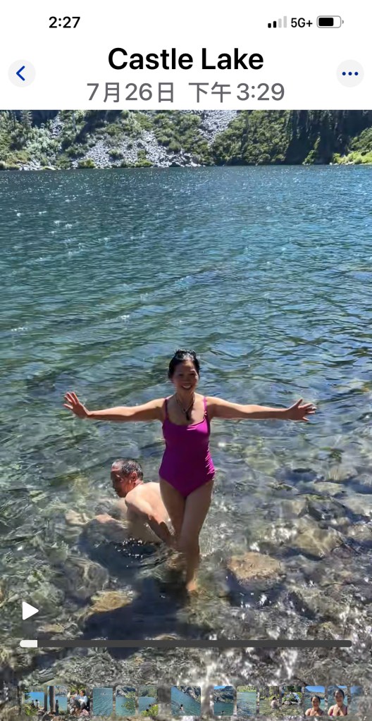 当我全然交托自己,就是在接受城堡湖的神圣恩典,让湖水的光能净化和疗愈我的身心灵。我边走向深处边摆动双臂,湖底有很多石头,经常会因为踩到石头而重心不稳,失去平衡,几乎摔倒,但每次都被无形的力量托举而重新校准,恢复平衡。我是宇宙的宠儿,是星际信使,被很好地保护着,不会有危险。此刻我沉浸在这蓝绿色的液态光子海洋中,沐浴着宇宙的圣爱之流,感受着地心的祝福频率,与水嬉戏,与精灵玩乐,与阳光共舞。时间过得飞快,转眼已是夕阳西下,气温也开始下降,山风带着深深的凉意拂过水面,湖水的寒意更深了。是时候离开了,但心不想走,只想待在水中,那高频能量是家的感觉,让我充满喜悦和快乐。正如高我所言:“城堡湖是雪士达山的一个巨大能量漩涡点,承载着独特的星际门户功能,它作为地心泰勒斯城的以太入口,属于第五维度的行星经络节点,连接着地球内部文明网络。在列姆利亚文明时期,它曾是水晶频率调节器的所在地,它的蓝绿色湖水至今仍保持着稳定地球磁栅的功能,这就解释了为何地心文明选择此处作为主要出入口”。而这也是我内心欢喜、不愿离去的原因。