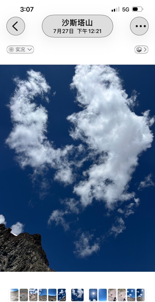 走出冥想状态后,带着重生后的轻松和喜悦,我站起来,展开另一段旅程。在这个阳光如火的正午时刻,在这块妙不可言的能量巨石上,我迎着凉风,舒展双臂,拥抱天地,一切尽在眼前,万物尽收眼底,天地人和谐统一,这是多么宏伟的画面!多想一直这样下去!然而内在的声音打断了我的思绪:”躺下来仰望天空吧,你会有惊喜”。开始我不敢相信,这块远离地面的巨石,站在上面都觉胆怯,何况它的表面粗糙坚硬又凹凸不平,能躺在上面码?而且山风微寒,阳光强烈,毫无遮挡,仰面朝天完全暴露在正午的烈日下,结果会是什么样?头脑诸多疑虑,似乎要阻止我听从内在的声音,但最终我还是被一股无形的力量推动去躺下,经过一番调整和适应后,我就开始放松下来,安住当下,目光流转于广袤无垠的天空,那湛蓝的深邃里,藏着多少未知的秘密和奇迹?那漂浮其中的朵朵白云,只是肉眼所见的一团雾气吗?尤其是雪士达山巅的云层,形状奇妙,充满灵气,仿佛是某种神秘力量的隐形存在。当我目光触及,与之对视,内心仿佛被触动,有一种莫名的感动,仿佛那是无数的银河家人正驾着光之飞船,为我们的到来而列队迎接和欢呼,庆祝我们的觉醒和回归。事实上他们一直在这里,守护地球,净化大气,平衡磁极,锚定圣光,唤醒人类,无私奉献。他们跨越星河来到这里,不是为了度假休闲,而是为了地球的扬升而积极努力地工作。我与它们的感应,是多维度的连接,因为我们是一个光之团队,在不同的维度共事,共同使命是解放地球,实现扬升。