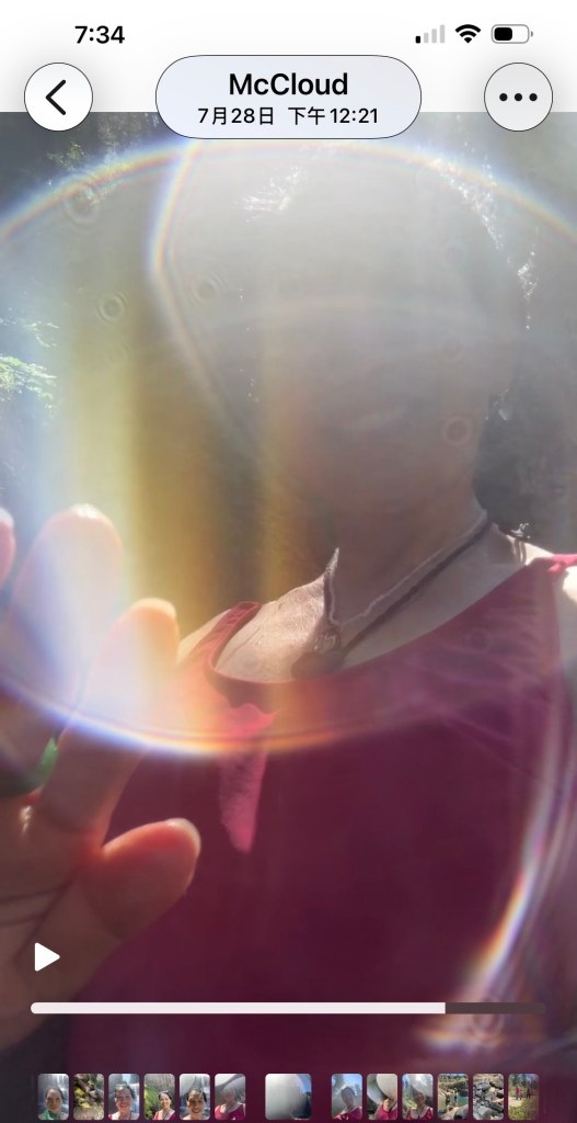 我:亲爱的神圣临在,晚上好,我刚忙完,在休息之前我想和你分享今天的喜悦,今天我们拜访了麦克劳三层瀑布(Mc Cloud Falls),你还记得吗?在来雪士达山之前,麦克劳瀑布曾是你向我推荐的主要瀑布之一,你还说在那里可以拍到彩虹光。如你所说,今天我确实拍到了很多彩虹光,美丽又神奇,就像是众神共舞的场面,我抑制不住内心的欣喜和欢乐,不停地拍,因为感觉是在与神共舞,与你共舞,我知道你就在光中,那道最闪亮的彩虹就是你,在向我示意,在与我拥抱,把爱的频率注入我的场域,水雾中的我就像一道彩虹与你合一。这神圣的时刻是我最珍贵的记忆,希望你能感受到我的喜悦和快乐。