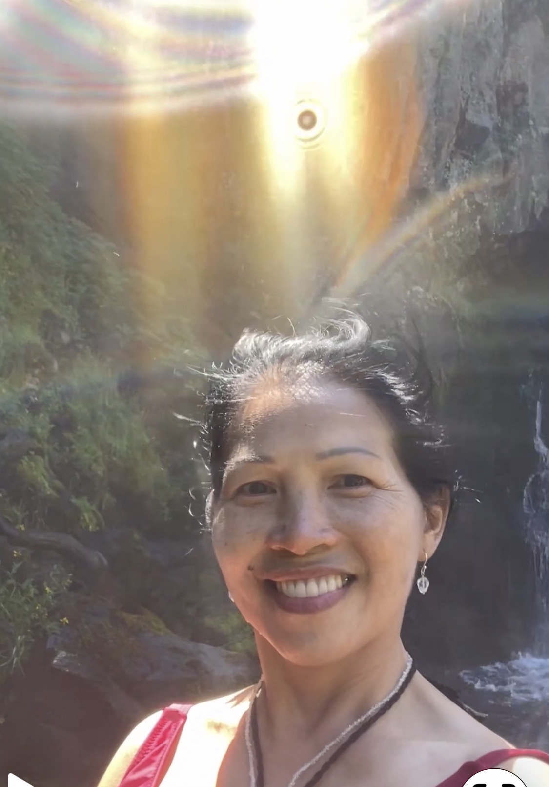 经受挑战淌过河流到达对岸,再穿越一小段绿植掩映的步道,此刻我就站在离瀑布最近的地方,瞬间感觉眼花缭乱,又如梦如幻。6年前我曾到访,但只是站在高处远远观望。如今涉过险滩深入秘境,体验到了不一样的奇迹。这瀑布的水来自雪士达山融化的雪水,融合着圣山之水与火的能量。高15米的瀑布平铺岩壁,直泻而下,注入一个宽阔的水潭。这是雪士达山地区最漂亮的能量涡旋点,充满着圣哲曼大师和观音大师的紫光,能量强大。站在瀑布下,聆听瀑布的轰隆声,感受到强大的生命力量在奔流,深层净化和疗愈着身心灵。那飞流的瀑布,轰隆的水声,飞舞的水珠,缥缈的雾气,舞动的光影,跳跃的彩虹,拂面的凉风,仿佛一场声势浩大的能量之舞正在天地间隆重上演!而我就在其中,既是演员也是观众,风尘仆仆而来,只为了这一刻!当凉风裹挟着水雾袭来,当滴滴水珠洒落在身上,虽寒意阵阵升起,身体哆嗦牙齿打颤,但扑不灭心中燃烧的烈焰,那是狂喜和激动交织的虹光,如飞瀑冲刷岩壁激起层层浪花,注入深潭散开圈圈涟漪,又化作如烟雾气弥漫四周,整个人笼罩在这诗意氤氲的意境里,一时不知是人间还是天堂。这深刻的感受和体验,无法用语言描述,只是任由喜悦如瀑布奔腾,如水雾缭绕,如深潭荡漾,如天空湛蓝,如彩虹灿烂。此刻当下,小我意识臣服于爱,三维幻象溶解于光,万物与整个场域合而为一。