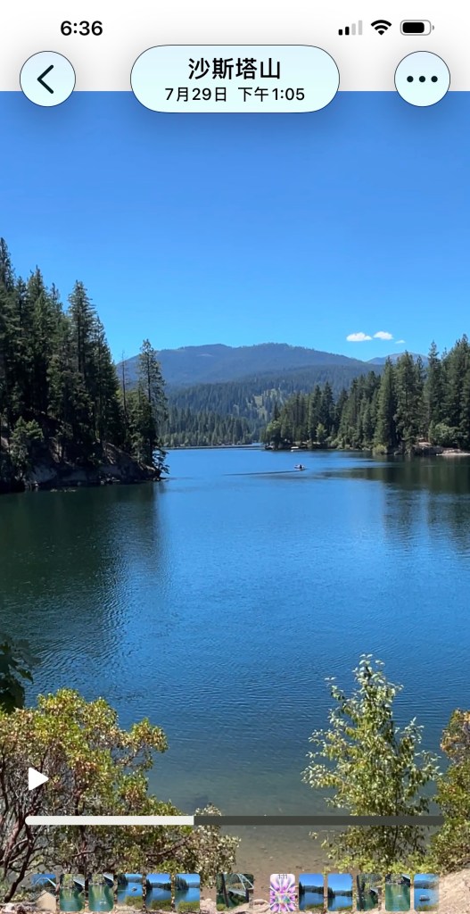 而接下来的湖边戏水,才是此行最后的驿站,也是最精彩的一站。离开人行天桥,我们来到了另一处安静的林间空地,这里是湖岸边的入口,可以从这里直达沙滩,进入水中,享受湖水的澄澈和周围的美景。湖泊由五条山间溪流汇聚而成,湖面宽阔,占地约1000英亩,气候温暖,景色宜人,湖水清澈湛蓝、波光粼粼,宁静祥和,时光静谧,氛围温馨,休闲活动丰富多彩,适合家庭游玩,可野餐、露营、独处或运动。那温暖的湖水适合游泳,那绵延数英里的沙滩海岸线适合悠闲漫步、安逸静躺、享受阳光或静心阅读。炎炎夏日里,浸泡在清凉的湖水中,欣赏湖边的秀丽风光,是多么美妙的感受!最令人心驰神往的是雪士达山,倒映在水中,成为水中圣殿,散发着神奇的能量和磁场,在此沐浴,是一场身心灵的净化和疗愈。