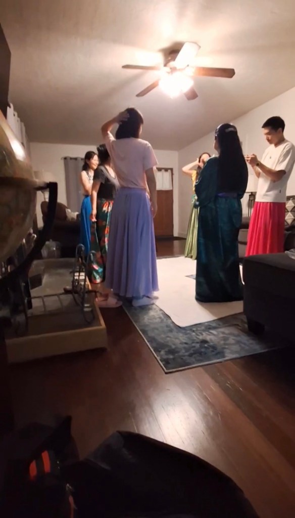 忙完这些,我就去换衣服,因为穿着家居服显得不够郑重。跟随内心的指引,我穿上紫色的衣服,再套上一件深绿色的长袍。这件长袍是我三年前买的,但从未穿过,只是洗干净挂在那里,每次看见都心生欢喜。这次带来也是高我的安排,因为这类长袍我有很多件,有紫色、粉红色、绿色、蓝色和白色的,而我偏偏选择要带上这件祖母绿的,心想如果有机会冥想,就可以穿上它,因为绿色是疗愈火焰。然而打包行李的过程中却几番取舍,犹豫不定,因为行李箱已满,两件托运行李已超重,水晶就带了六、七磅,还有各种衣物鞋帽,洗漱用品、登山用品、相机、Ipad、充电宝、厨具调料和食物等必需品,每个人的随身行李和背包都已塞满,无法装下更多东西,但每样东西都是需要带上的,最后忍痛割爱,从行李箱中拿出几件物品,当我拿出这件绿色长袍时,内在的声音说:”带上吧,也不重”,于是听从这个声音,带上了。而现在,当我打开行李箱,看着琳琅满目的衣服时,毫不犹豫地,我选择了它。感恩高我的指引,让它与我一起踏上这趟旅程,静待多年,它终于有机会服务于我,而且是在这样的殊胜场合,在这样的神圣聚会,这是它的使命,也是它存在的意义,在这个充满奇迹的夜晚,它一定会绽放出更加璀璨的绿色疗愈之光,去抚慰和疗愈在场的所有人。