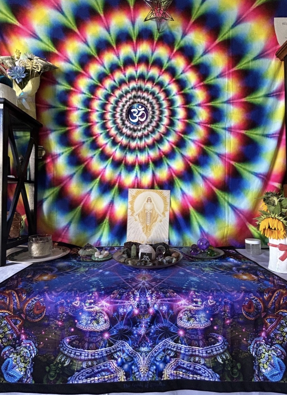 然而当我环顾客厅,感觉似乎缺少了什么,整个氛围好像与这次聚会的能量层级不协调,应该再添加一些神圣物品以提升空间的能量,毕竟这个客厅只是日常活动的普通场所,能量有些混乱,必须圣化一下,心念刚起,脑海中就立即浮现出一个画面:亚特兰蒂斯之门挂毯!我心中一喜,哦,对啊!那张“亚特兰蒂斯之门”挂毯!立即转身进入女儿的房间,站到椅子上,伸手取下墙上的那张挂毯。这是我从家里带来的,本想着如果有机会进行冥想,就铺上它作为神圣空间,增加氛围感,锚定能量。但一直忙于探访圣地 ,没有时间静下心来冥想,偶有闲空时,又没有想起,反而是忙别的事,所以一直没有在住处冥想过,这张挂毯也一直没能派上用场。但就在两天前,我走进女儿的房间,不经意中又抬头看见她床头对面的墙上那幅巨大的艺术画作,灰黑低沉的色调和怪异的画面感,让人感觉不舒服,其实第一天住进来时,我就不喜欢这幅画,但心想就住10天,不可能把它拆下来吧,心里祝福着住在里面的女儿,然后就放下了。但这次再次看见,那不舒服的感觉更加强烈,担心它会影响女儿的睡眠和健康,必须处理一下才安心,于是从行李箱中取出这张挂毯把画面遮住,奇妙的是,挂毯刚好能完全覆盖整个画框,而且很轻易就挂好了,因为画板的边框较宽,只要把挂毯搭在它上方的边缘即可。挂好后,整个房间的能量瞬间被提升,让人感觉舒服愉悦。而此刻,高我指引我用它来装点客厅,建立圣坛,我毫不犹豫地取下来,把它铺在茶几上,接着拿来水晶、鼠尾草,天使卡片和灵性图腾摆在上面,这些卡片是昨天在水晶店请回来的,此时正好可以庄严圣坛。这个小小的神圣空间,在灯光下闪耀着美丽的光芒,整个客厅瞬间变得庄严,流光溢彩。