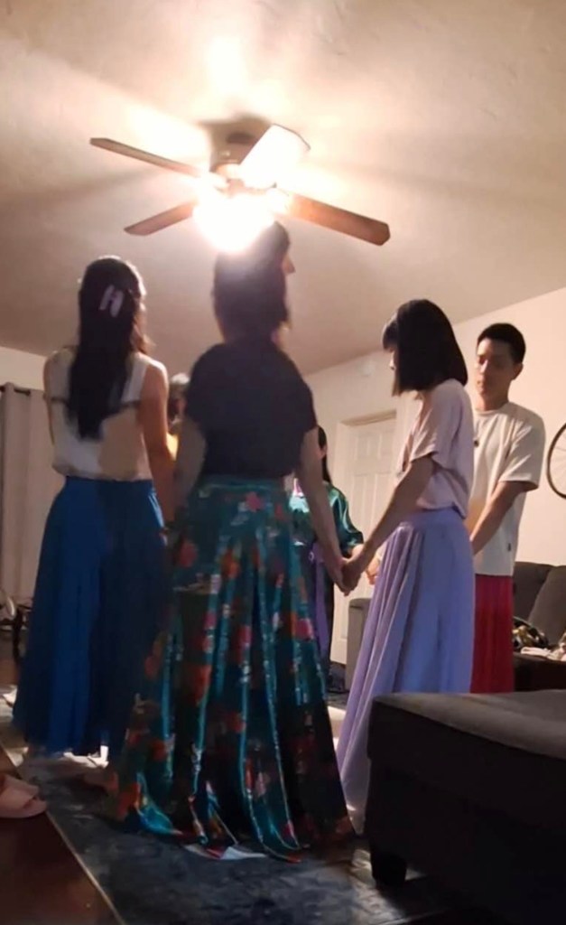 现场气氛活跃,舞蹈,释放,尽情展示自己女神的本质和天使的特质,这就是我们真实的自己,这就是我们原本所是的模样,在此刻可以全然地表达,无需掩藏内在的光,而光就是那个觉醒的自由的自己。我们的责任就是喜悦,欢乐,歌唱,跳舞,玩耍,像孩子一样简单纯真,心无杂念,融入当下,感受此时的能量,接受圣爱的洗礼,此时此地,就是天堂。看着女神们美丽的舞姿和快乐的笑脸,我也深受感染,充满喜悦,回想起刚才大家围坐圣坛前聊天时,我突然得到关于舞蹈长裙的灵感,于是问道:“我带了很多漂亮的裙子来,大家要不要穿上裙子做个仪式?”Zoe说好啊!于是我从两个行李箱中拿出几条裙子,这些五颜六色的长裙,是我在这一两年内陆陆续续从网上和实体店铺买回来的,但从未穿过,只是洗净挂好,这是我的习惯,买回来的新衣服一定会先洗干净,然后挂起来,至于何时穿,需要看心情和场合的需要,而这些裙子一直没有穿,是因为没有合适的场合与机会,唯独那条蓝色裙子,那天带到城堡湖,在进入湖水之前穿了两分钟拍了个短视频,回来后就洗净烘干收进了行李箱,打算就这样带回去,没想到现在有机会让它们亮相,服务于光之旅程。神奇的是,我只带了这几条,不多也不少,刚好每人可以穿一条,而我事先并不知道会有聚会,更不知道会有多少人参与,而明知道雪士达山之旅都是爬山涉水,没有机会穿这些裙子,但还是带了。姐妹们挑了自己喜欢的颜色,当时Fank走出门外一会返回时,只剩下那条粉红色的,他也欣然穿上,这把大家逗乐了,欢乐的笑声如爆发的新星响彻云天。奇妙的是,当晚我选择穿绿色长袍而不是裙子,这才刚好够分。哇!你能说这是巧合吗?
