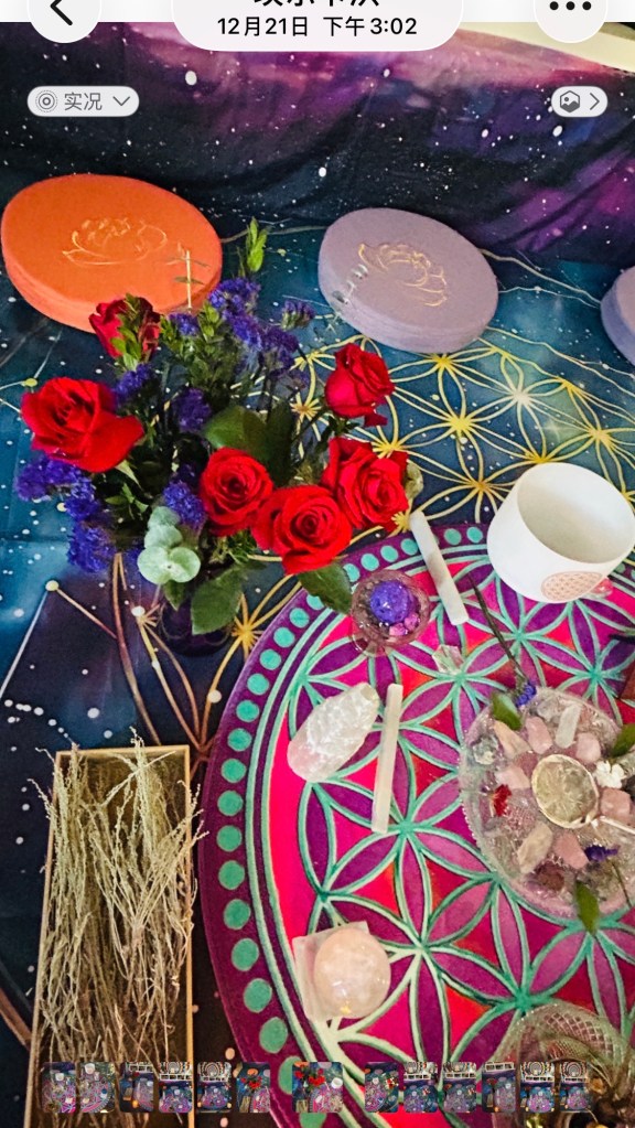 我沉浸于内心的喜悦,把仪式现场布置得庄严美丽,充满高频能量。这就是丰盛的显化,光和爱就是丰盛,宇宙和生命就是丰盛,因此,我把它由内而外地表达出来。不是为了做样子给谁看,而是这样做时内心充满喜悦和欢乐,因为真正的丰盛是一种能量,是爱和喜悦的流动。为了配合此次冬至门户的强大能量,昨天我跟随内在的指引,处于静心,与自己独处,锚定内心的稳定频率,为神圣的仪式准备好自己。今天早晨,天气晴朗,心情舒畅,去公园静心了一会,接触自然,随意舞蹈,连接源头,祈祷祝福,接受阳光的净化和充电,以饱满的能量状态迎接这场仪式,这是我对自己的承诺,也是对每一位参与者的负责。作为光之工作者,首先要照顾好自己,让自己成为强大的光源,成为纯净的管道,才能更好地服务他人。
