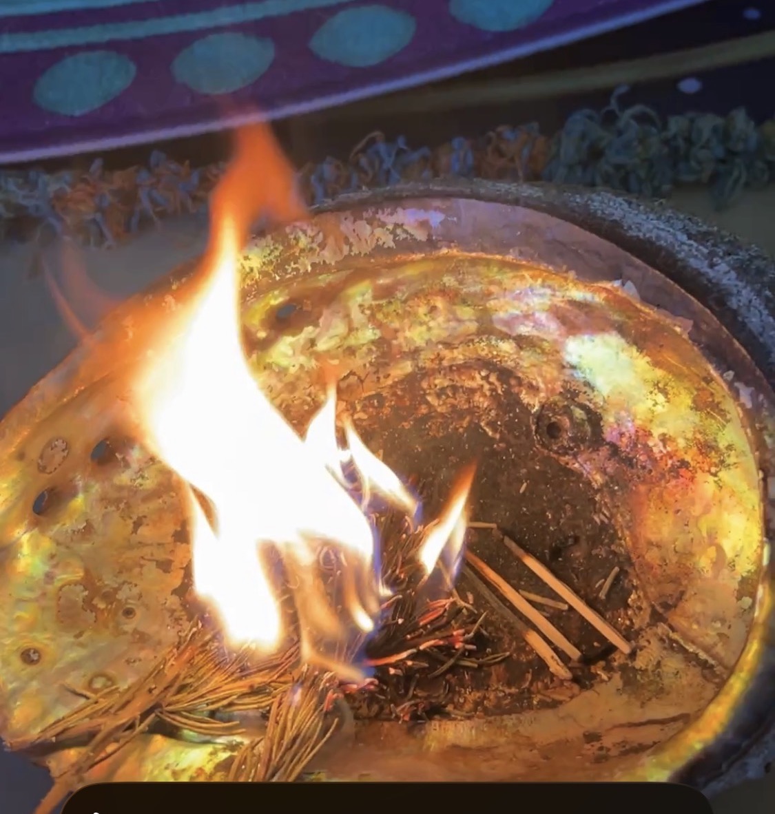 仪式开始前,燃烧雪松和鼠尾草时,火焰呈现灵动的跳跃状态,像是精灵在欢乐起舞,庆祝这次疗愈之旅的展开。当时我专注于火焰和烟雾的升起,突然内在一个声音提醒:拍照。哦,对啊,拍个照吧,立即起身去拿来手机开始拍照,边拍边照看着火盆。拍完后就把手机放到一边,继续工作。直到晚上临睡前翻看手机相册,才发现照片上的火焰呈现奇特的形状,好像是随风飘舞的样子,但当时屋子的门窗关闭,室内无风,是火焰自己翩翩起舞?放大照片细看,发现火焰的边缘是紫色的,这是紫罗兰火焰在燃烧,还是女神能量在舞蹈?火元素是强大的净化工具,这是七道圣火在协助净化和守护场域吗?感恩内在的指引,让我拍下这伟大的真相和启示。