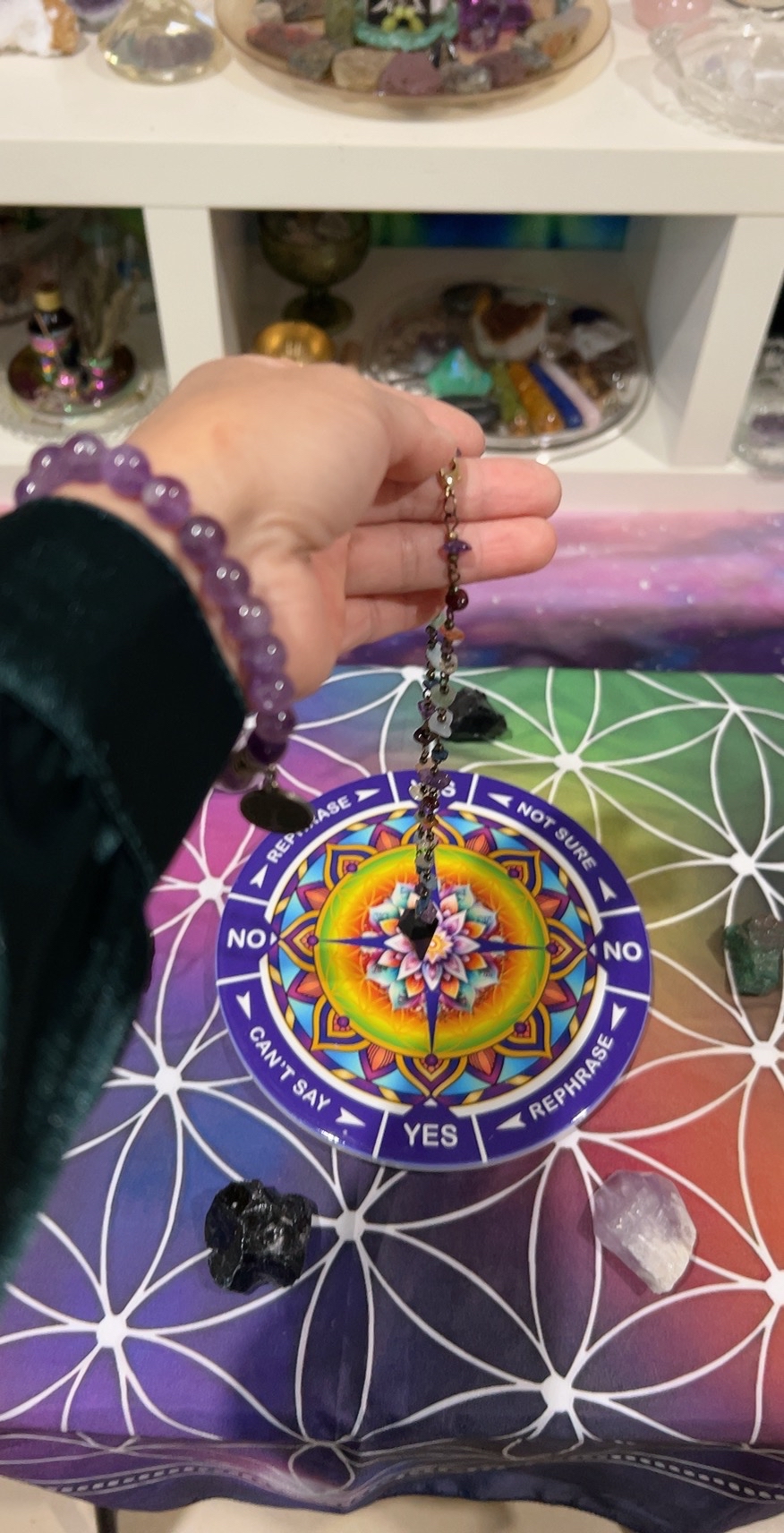 灵摆虽是个简单的装置,却联结着从古至今的智慧,在许多古老和现代的灵性传统中占有一席之地,可用于占卜、答疑解惑,寻找失物、探测人体能量、寻找地脉或水源、能量清理与平衡、脉轮测试、能量检测等。我的第一个灵摆是黑碧玺摆锤,这是商家提供的关于它的信息:”这是一个能量强大的宝石水晶摆锤项链,对于灵性工作者来说意义非凡!它采用最高品质的抛光黑碧玺制作而成,展现黑碧玺强大的天然能量。项链上的宝石均为疗愈水晶,可用于各种能量疗愈,驱散生活中的负能量。摆锤悬挂于一条缠绕着彩虹脉轮宝石的链子上,用于强大的水晶疗愈,汲取来自宇宙乃至更广阔空间的能量。整条链子串满了各种色彩缤纷、饱满亮丽的宝石,这些宝石包括石榴石、红玉髓、黄水晶、东陵玉、海蓝宝石、青金石和紫水晶。这是一款用途广泛的可转换式饰品,既可作为传统项链佩戴,也可在需要精神指引时将摆锤靠近。利用这些水晶的疗愈能量,辅助摆锤占卜,解答疑问、辅助决策、疗愈身心、净化空间、驱散负能量,或寻找遗失物品。摆锤充当你与灵性导师之间的接收器和发射器,助你开启直觉和第六感。不用时,它也是神圣空间、祭坛或装饰的完美之选”。