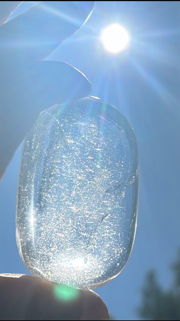 昨天(2月8日)上午我去公园之前,突然被指引去拿起那颗列穆里亚白水晶掌石。面对它时,我感到有些歉意,因为自从一个月前我拿回前世的技能、专注于学习使用灵摆和神谕卡并接触到更高阶的安达拉水晶后,我的焦点就从它的身上移开了,以至于不再关注它,任其在一旁静静发光。此刻它引起我的关注,似在提醒我:“带我去公园吧,我也要晒晒太阳”。而当我拿起它,下意识地举起来看时,发现了一个惊天秘密:原本透明如镜、空无一物的晶体内部,如今竟充满了绵绵密密的光点,是闪闪烁烁、满天星光的奇景,就像一片银河突然坠落在了我的掌间!这让我惊叹又惊奇!这颗神奇的列穆利亚水晶疗愈大师,在与我共事后,竟以肉眼可见的速度在生长和扩展,悄无声息却坚定不移地在虚空中种下星光,让九天银河化作绚丽之诗,绽放在我的掌心,流转于我的指缝。这是圣光融入物质的体现,就像灵魂之光注入身体载具,身体成为光之载体一样。