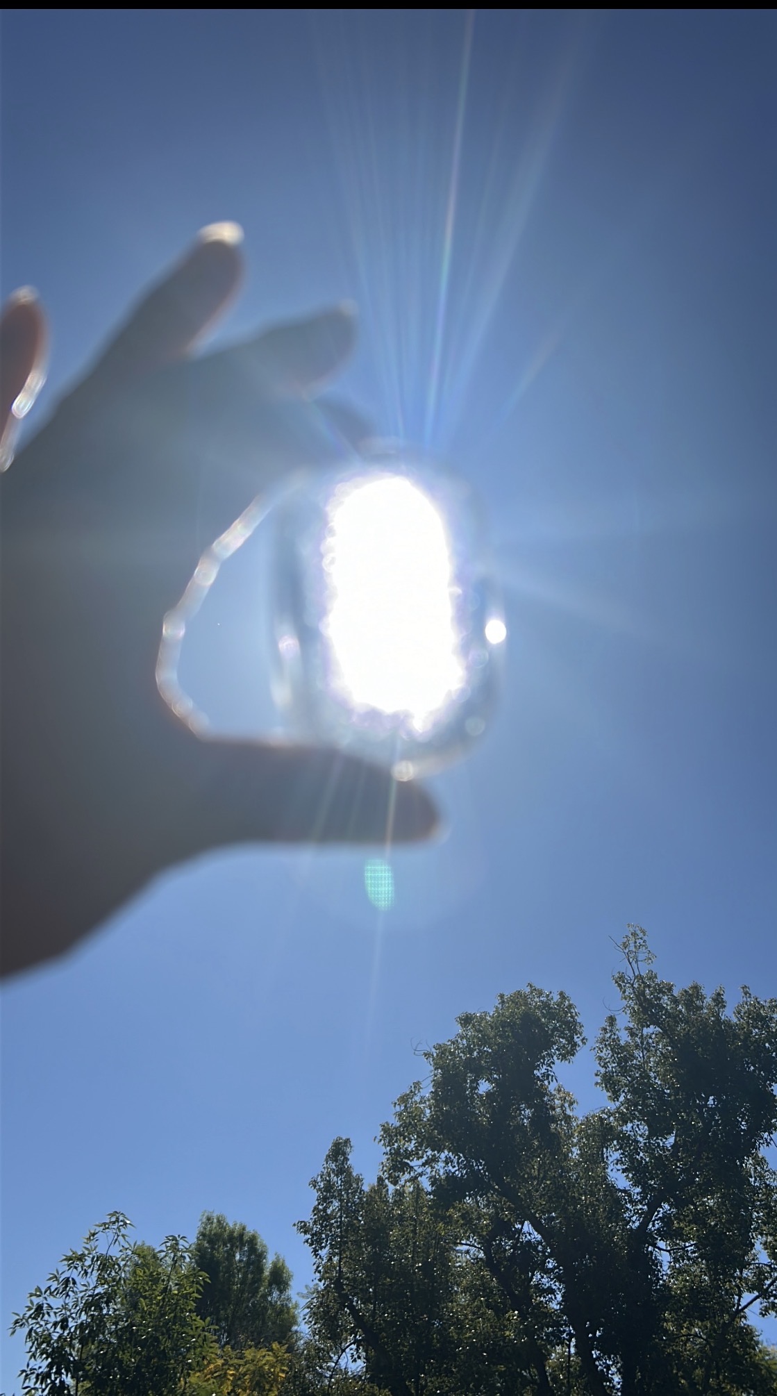 昨天(2月8日)上午我去公园之前,突然被指引去拿起那颗列穆里亚白水晶掌石。面对它时,我感到有些歉意,因为自从一个月前我拿回前世的技能、专注于学习使用灵摆和神谕卡并接触到更高阶的安达拉水晶后,我的焦点就从它的身上移开了,以至于不再关注它,任其在一旁静静发光。此刻它引起我的关注,似在提醒我:“带我去公园吧,我也要晒晒太阳”。而当我拿起它,下意识地举起来看时,发现了一个惊天秘密:原本透明如镜、空无一物的晶体内部,如今竟充满了绵绵密密的光点,是闪闪烁烁、满天星光的奇景,就像一片银河突然坠落在了我的掌间!这让我惊叹又惊奇!这颗神奇的列穆利亚水晶疗愈大师,在与我共事后,竟以肉眼可见的速度在生长和扩展,悄无声息却坚定不移地在虚空中种下星光,让九天银河化作绚丽之诗,绽放在我的掌心,流转于我的指缝。这是圣光融入物质的体现,就像灵魂之光注入身体载具,身体成为光之载体一样。