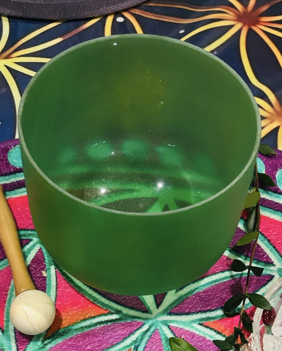 我捧着绿色水晶钵回到座位坐下,左手托钵,右手敲打,声音乍起,意境瞬间转变,它的声音与铜钵完全不同,感觉更轻盈、更空灵。如果说铜钵是向下扎根、沉稳接地,作用于物质层面,那么它就是向上飞升、连接天界,作用于意识层面。这个8英寸F音调的432赫兹心轮疗愈颂钵,与心轮产生共鸣,有助于唤醒爱、内心平静、慈悲和喜悦之情。它清澈悠长的音色营造出宁静的氛围,有助于深层的情感释放,缓解焦虑和压力,舒缓身心。非常适合冥想、声音疗愈、脉轮疗愈、脉轮平衡、情绪调节和灵性疗愈,促进身心健康,辅助灵性修行。此刻明白为何高我指引我使用绿色水晶钵了。我边敲边感受钵音的美妙,偶尔也会凝视其中,为它注入光,加强其效果。眼前的美丽灵魂还在熟睡,鼾声若隐若现,或许她也觉察到了声音的改变,但仍是纹丝不动,尽情享受着音浴带来的放松与舒适。