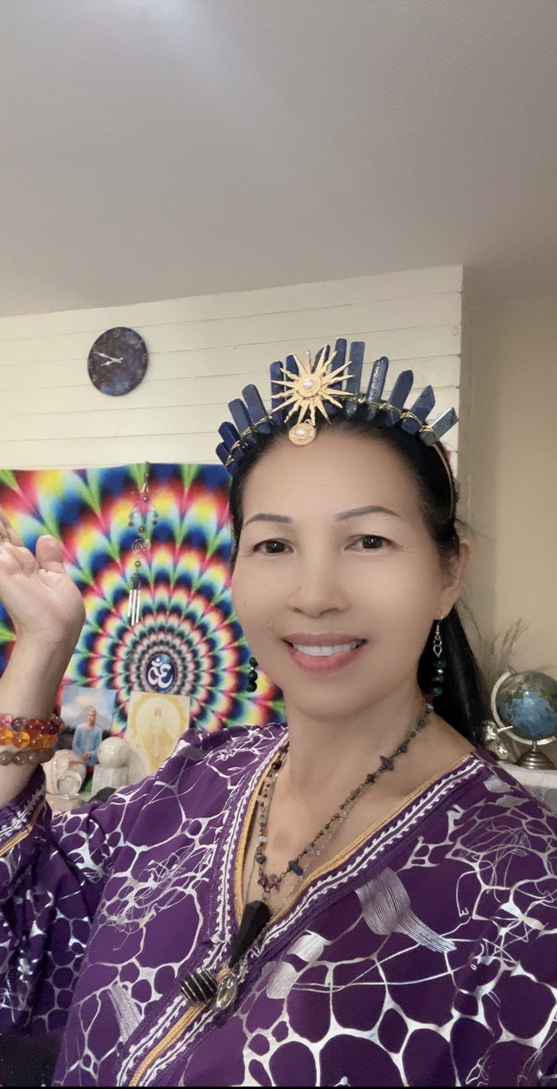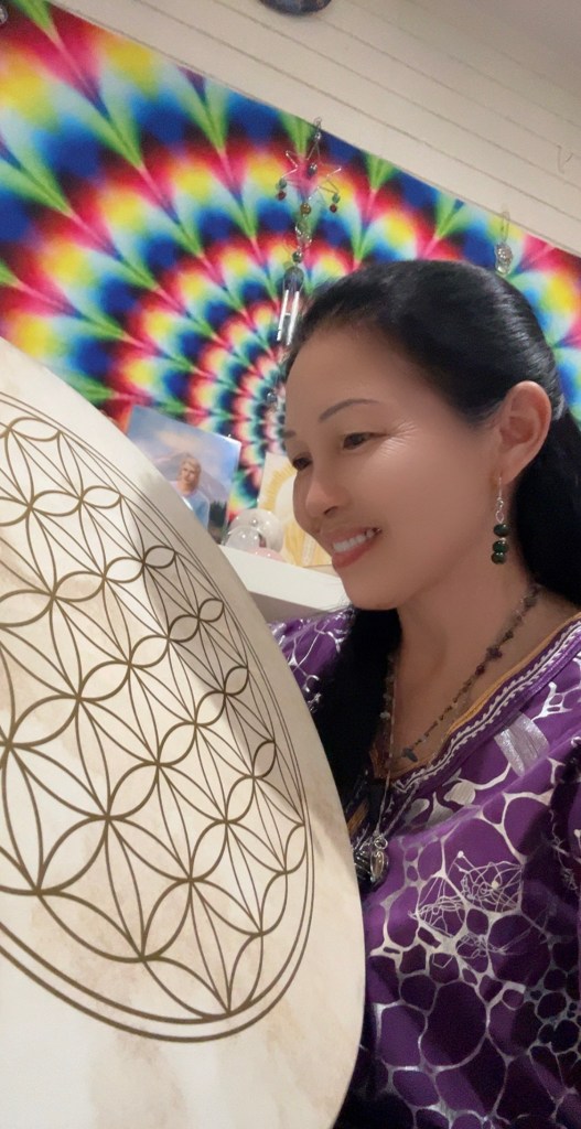 顿了顿,就伸手去摸着左腿说:“刚才你敲钵时,我的腿震颤,”然后抬起腿指给我看,说:“就是这里,我睡觉时它一直震动”。边说边活动腿部。我走到她右侧的坐垫坐下来说:“那是能量在流动,钵音的震动在修复和调整你腿部的能量”。然后她又举起右手,用另一只手抚摸着手臂说:“刚才我的手臂麻,像有电流通过”。我说你的手臂因为常提重物承受压力而疲劳,麻是因为钵音在疗愈它,舒缓它。她让我记录下她的这些体验,然后语气坚定地说:“你给了我光”。我说:“不是我给了你光,是我激活了你内在的光,你的内在本就有光,那是每个人都有的神圣之光”。她不同意这个说法,坚持说是我给了她光,然后用两手的食指放在眉心轮说:“我睡觉时看见光,是橙色和粉红色的光,从这里出去,然后又回来”,问我这代表什么?我也不是很清楚,而且我对她的这个体验并不是很在意,因为闭上眼睛看见光是很平常的事,特别是在静心冥想状态。便按自己的理解告诉她:“那是你的高我和天使团队向你展示自己,让你知道他们就在你身边陪伴你,疗愈你,你并不孤单”。她显然不满意这个答案,继续描述那个画面并再次询问,然后坐起来,边说边比划,两手食指从眉心轮向前伸出去,在大约10公分处,两指从中间分开,各自往左右两边画一个半圆,然后回到眉心轮,汇聚成一个点,这样重复了几次,反复强调是橙色和粉红色,还挪了挪身体,指着生命之花地垫上的一块颜色说:“就是这个粉红色,比这个深一点的粉红色,还有橙色”。她一脸认真,看来这个画面让她记忆深刻,才会反复描绘、再三强调。她边描述自己的感受边说:“你要把这些记录下来,这是我的真实体验,我分享给你,你要把它写下来,这会帮助你提升,因为每个人的体验都不一样,这是我的体验”。然后自言自语道:“这些颜色代表什么?”